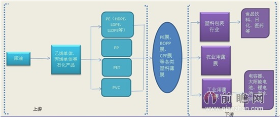 塑料薄膜行业的上游行业主要是生产各类合成树脂的石油化工企业,下游行业主要包装行业(塑料包装薄膜用于食品加工、日用品、医药用品领域)、农业(农产品生产过程中需使用农业用塑料薄膜)、工业(电容器、锂电池、太阳能电池以及海水淡化等领域均需用到塑料薄膜)。